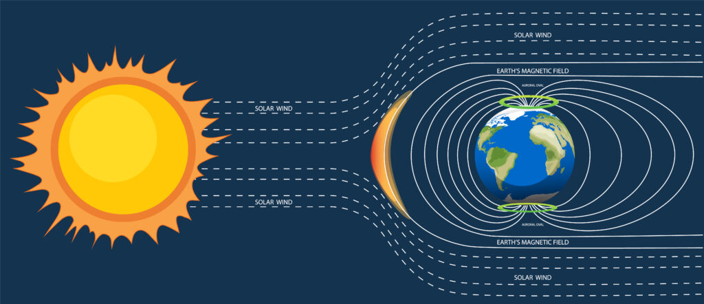 Die Polarlichter (Aurora borealis) entstehen durch Plasma, das von der Sonne ins All ausgestoßen wird. Dieses Plasma besteht aus elektrisch geladenen Teilchen und breitet sich mit hoher Geschwindigkeit im Weltraum aus. Ein Teil dieser geladenen Teilchen trifft auf die Erde. Die Erde ist von einem starken Magnetfeld umgeben. Dieses wirkt wie ein Schutzschild und lenkt die geladenen Teilchen ab, anstatt sie ungehindert auf die Erdoberfläche treffen zu lassen. Entlang der Magnetfeldlinien werden sie in Richtung der Polarregionen geleitet.